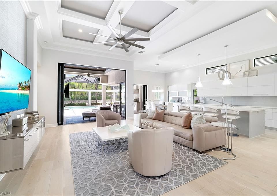 Welcome to this stunning modern residence nestled in an exclusive gated community of Miromar Lakes Beach and Golf Club, where elegance meets comfort. This meticulously designed home boasts of warm hardwood floors seamlessly throughout with open concept living spaces, creating a cozy yet contemporary atmosphere. This gourmet kitchen is a chef's dream, featuring top-of-the line appliances, sleek cabinetry, and large island perfect for entertaining. The spacious primary suite offers a private retreat with views of the water and a spa-inspired ensuite bathroom and generous walk-in closet space. Additional bedrooms are well appointed and ideal for guests or a growing family. Step outside to your own private oasis an expansive lanai perfect for relaxing or entertaining. With 24/7 security, lush landscaping and exclusive access to neighborhood amenities, this home offers the perfect blend of privacy, luxury, and convenience. Miromar features 700 acres of fresh-water lakes, with boating, fishing, swimming, water skiing, 3 miles of sand beaches, Caribbean style beach grill, club house, pool, full-service spa, fitness center, golf, tennis and many other luxurious amenities.