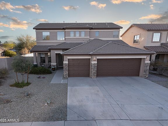 Step into the Estrella Lifestyle with this move-in ready home, featuring fully paid owned solar system for energy efficiency & savings! Recently refreshed with new paint inside & out (Dec. 2024), this charming home offers 3 spacious bedrooms, 3 full baths & a versatile bonus room on the lower level - perfect as office, study or guest room. As you enter, you'll be greeted by a bright, airy foyer that flows into open-concept living/dining area bathed in natural light. Main level has tile flooring throughout. Kitchen is open to breakfast area & spacious family room, & boasts white cabinets, solid surface counters, reverse osmosis & stainless steel appliances, including microwave, dishwasher & side-by-side refrigerator. Laundry room conveniently located near kitchen, including washer & dryer. A full bath on main floor conveniently located near bonus rm opens directly to the backyard, where you'll find an inviting & relaxing spa. The oversized backyard has been professionally landscaped & features a covered patio, sunshades & low-maintenance artificial turf & crushed granite, creating a serene space to unwind or entertain. Back inside the home, don't miss the large under-stairs closet that offers additional storage space. Upstairs, expansive loft area boasts mountain views, creating the ideal space for work or play. Generously sized primary ensuite features separate shower, garden tub, dual-sink vanity & walk-in closet. Two additional bedrooms & a bathroom complete the upper level, where you'll find cozy carpeted floors while the bathrooms are nicely tiled. Convenient service door from spacious 3 car garage. Living in Estrella means access to exceptional amenities, including two clubhouses, swimming pools, fitness centers, basketball courts, pickleball courts, two beautiful community lakes, miles of walking and biking trails, and the exclusive Troon-managed Jack Nicklaus 18-hole golf course. Plus, you'll be close to shopping, Spring Training facilities, Phoenix Raceway, major freeways & both elementary & high schools. This home offers the perfect balance of comfort, convenience & luxury in the heart of Estrella!
