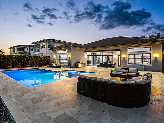 Welcome to 17442 Rosella Rd -- an exceptional Murano Model from the Coastal Collection, now being offered for the first time in the prestigious Boca Bridges. This expansive one-story residence spans 3,792+/- sq ft under air and showcases designer upgrades far beyond builder finishes. Perfectly positioned on a quiet cul-de-sac with ideal southern exposure, the home is light, bright, and thoughtfully appointed. Soaring ceilings with detailed coffered designs add architectural elegance, while custom landscape lighting brings the property to life after sunset.The heart of the home features a gourmet kitchen with Sub-Zero appliances, double wall ovens, and an oversized island overlooking the open-concept living space and dining/club room -- all seamlessly connected to the backyard. The floorplan includes three spacious ensuite bedrooms plus a versatile den ideal for an office, media room, or optional fourth bedroom. Step outside to a private resort-style setting with a 35' x 25' custom saltwater pool, sunshelf, and over 3,000 sq ft of rear patio space including a large covered area perfect for entertaining.