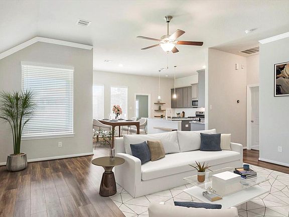 This fabulous Dawson floorplan is a single story 3-bedroom, 2-bathroom home perfect for a family looking for either their starter or right-sized forever home. A wide foyer adds appeal to the front door entrance, leading to an open concept family room and kitchen including a granite island with a ceramic single bowl sink and an adjoining dining area. The spacious owner suite is accompanied by a marvelous primary ensuite with separate split vanity sinks, a deep soaking tub, separate walk-in shower, and an enormous walk-in closet. The covered patio with an extended brick paver deck in the backyard provides the perfect backdrop for entertainment!