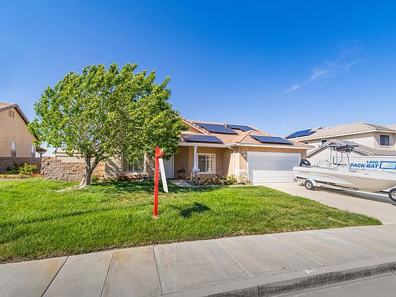 BEAUTIFUL SINGLE STORY VIEW HOME WITH PAID SOLAR PANELS located in desirable West Palmdale Amber Ridge community is ready to move into!! This extremely rare find features a breathtaking, clear unobstructed 270 degree view of the Antelope Valley you will love!! Wonderful open floor plan, this lovely home with exterior layered bouquet stone boasts over 1700 sq ft of living space including a formal living room/dining room, family room with cozy electric fireplace right off of the newly remodeled kitchen along with 3 bedrooms, a possible 4th bedroom or den/office and 2 full baths!! This home is absolutely gorgeous with all new luxury laminate floors throughout, plantation shutters and 2 completely remodeled bathrooms too!! The master suite features an en suite that is extraordinary with separate fully tiled shower and tub, new vanities, new sinks and new fixtures!! The gourmet kitchen boasts all new Quartz countertops and newly painted white cabinetry with large center island!! Step out to admire your incredible private backyard view with an end to end covered patio and convenient storage shed!! The seller is offering paid off solar with a full price offer saving you $1000's of dollars a year on your electric bills!! There is even a master cool evaporative cooler in addition to central A/C unit!! All this and more so hurry to see this fantastic home today!!
