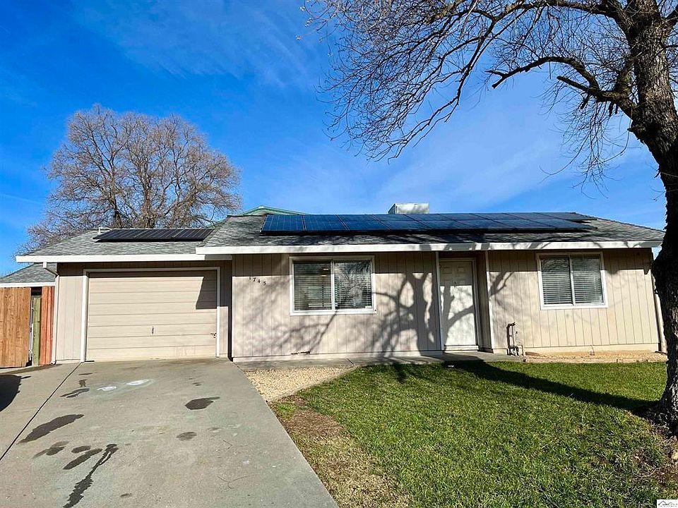 Welcome to 1745 El Cerrito Drive, Red Bluff, CA! This charming home boasts an open floor plan with vaulted ceilings, creating a spacious and inviting atmosphere. Enjoy energy efficiency with a solar system, complemented by a new HVAC system (2023) and water heater (2023). The kitchen features modern amenities, including a stainless steel refrigerator and gas range. The well-designed layout includes a large master bedroom on one side, providing privacy, while the other two bedrooms are situated on the opposite side. Revel in the fresh look of new paint and carpet throughout. Tucked away at the end of a quiet cul-de-sac, this residence offers tranquility on a large pie-shaped lot, fully fenced in. Dual RV access adds convenience to this wonderful home.