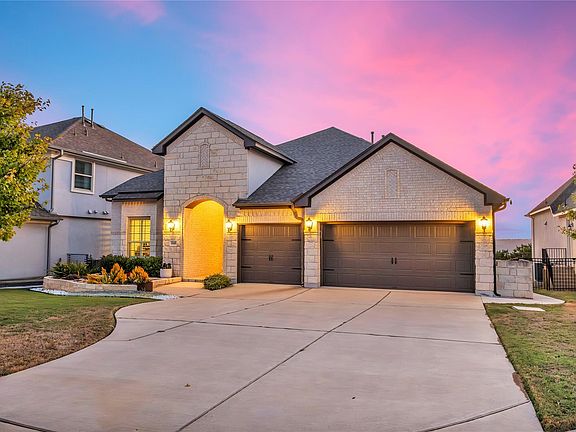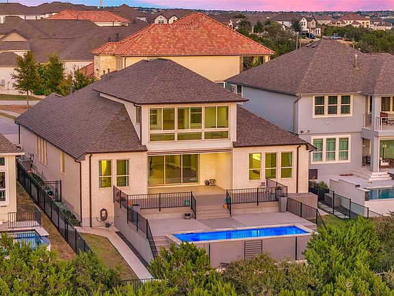 Move-in ready! Nestled at the top of Travisso, this stunning east facing home offers unparalleled hill country sunset views. A perfect blend of elegance and comfort this home features two luxurious primary suites and an additional guest room on the main floor. The second floor has a versatile flex space, ideal for fourth bedroom, a game room, or media room; complete with breathtaking views from the unique four-season room. Upstairs is a full bath and walk-in closet. Work from home in the dedicated office on the main floor. The backyard is a personal oasis, featuring a built-in pool and panoramic views! Inside, enjoy new carpet in the bedrooms, custom crown moldings, surround sound, and practical built-in shelving with a workbench in the garage. Situated on a quiet cul-de-sac, this east-facing home offers privacy and tranquility on a generously sized lot. *Price is less than recent appraisal. Motivated Seller!
