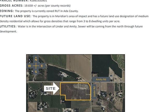 The property is located in Meridian’s area of impact with a future land use of medium density residential. Water is in the intersection of Linder and Amity Rd. Sewer will be coming from the north through future development.