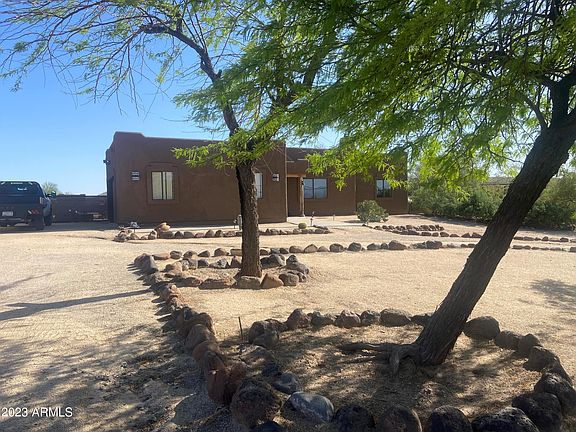 Priced right & ready to move. Solid site-built home on a fully fenced & flat acre+. A light & bright 3 bed/2 bath, split bedroom floorplan. S/S appliances in the kitchen & a window overlooking the backyard. Spacious master bedroom with double sinks & walk-in closet. Roomy great room with gas fireplace. Covered back patio & courtyard fence with extended pavers & easy-care desert landscape. 1/4 minus covers front & back for a clean look & to minimize dust. 2 car garage attached & detached 1 car garage with roll up & man door-use as garage, tack room or....... North/South facing. ON A PAVED ROAD. Shared well 4 ways. Large arena/turnout & 3-stall barn with shade, water & electric.