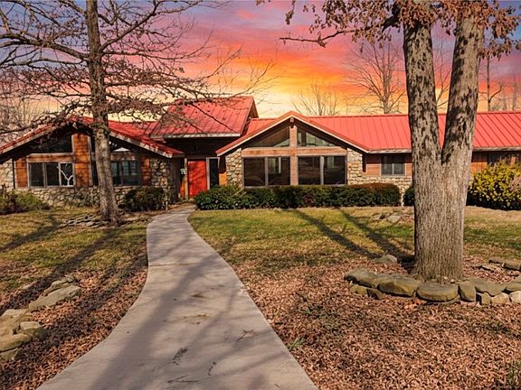 Tucked in nearly 30 rolling acres just outside Rogers, this striking modern home offers breathtaking Ozark Mtn views & a true connection to nature. Designed w/ clean lines & geometric windows reminiscent of F.L. Wright, it blends modern architecture w/ tranquil natural beauty. Main level features a gourmet kitchen, cathedral ceilings & 2 spacious living areas—ideal for entertaining or everyday living. Lower-level in-law suite w/ private entrance offers flexibility for guests or multi-gen living. Escape light pollution—stargaze by the fire on the large deck or catch panoramic sunset views over a peaceful valley. Fenced, flat front lawn & gardens add charm, while a detached wrkshp & 4-car garage provide practicality & room to create. Multiple bldg sites offer room to expand or customize your dream retreat. Just 12 mi from Hobbs St Park–Conservation Area w/ 50+ mi of trails & Beaver Lake nearby. Monte Ne Boat Ramp & Prairie Creek Marina mins away. A rare blend of design, serenity & adventure in NW Arkansas- see today!