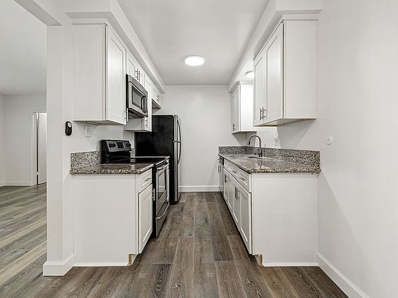 Remodeled 2 Bedroom 1 Bathroom with: Shaker white cabinets in the kitchen and bathroom, granite, tile floors in the kitchen and bathroom, stylish wood laminate floors in the living room, carpet in bedroom, STAINLESS STEEL APPLIANCES, crown molding in living room, and A SMOOTH LIVING ROOM AND KITCHEN CEILING! Controlled Access building. This unit also includes a 1 gated carport parking spot. 1 Year Minimum Lease. View pics of similar unit 12Months