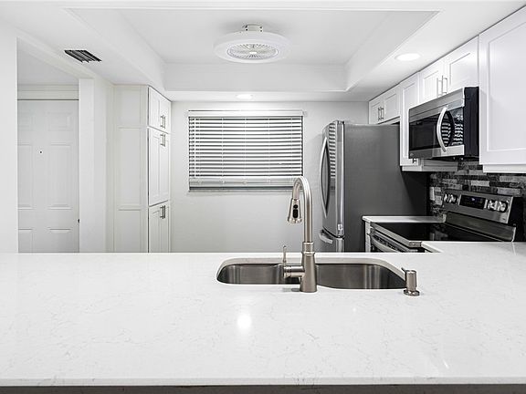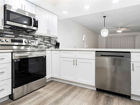 Welcome to an inviting, COMPLETELY REBUILT EVERYTHING BRAND NEW move-in ready condo conveniently situated on the ground floor! Step into the thoughtfully designed kitchen, featuring sleek white wood shaker cabinets, elegant quartz countertops, beautiful brick backsplash, stainless steel appliances, and additional pantry! The spacious great room seamlessly combines the dining and living areas, adorned with tasteful vinyl flooring throughout. Discover comfort in the two well-appointed bedrooms, accompanied by two full bathrooms showcasing beautifully updated vanities, luxurious quartz countertops, stunning large tiles, newly fitted fixtures, bringing a touch of modern elegance to the space! Each unit has a dedicated carport with an additional spot for a second vehicle, an exterior storage closet, and a delightful screened-in lanai adorned with elegant slate tile. Nestled within the esteemed Newport Glen community. Maintained grounds, shaded by majestic oak trees, and take pleasure in the tranquil ambiance of benches surrounding the lakes. Additionally, the community amenities include a refreshing pool and spa,tennis, pickle-ball