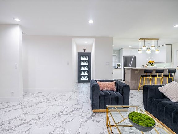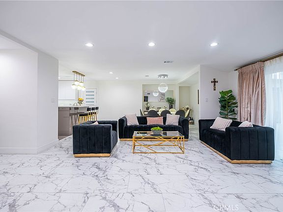 Nestled on a coveted street in Granada Hills, is this charming residence boasting 3 bedrooms and 2 bathrooms. With a pristine interior spanning 1,384 square feet, the home exudes sophistication, featuring captivating details such as marble tile flooring, high smooth ceilings adorned with recessed lighting, central AC and Heating, and generous storage throughout. Upon entry, the well-lit open floor plan welcomes you with a living room highlighted by a fireplace and a formal dining area adorned by an elegant chandelier. The seamless flow between these spaces and the chef's kitchen creates an ideal environment for hosting guests. The kitchen is equipped with top-of-the-line appliances, a farmhouse sink, sleek countertops, and a stylish backsplash, complemented by custom cabinets and a center island with bar stool seating for casual dining. Both bathrooms boast ornamental wall backsplashes and ample storage, while the bright and spacious bedrooms feature large, deep closets. The primary bedroom enjoys the luxury of a private ensuite bathroom. The property, spanning on a generous lot, includes an attached 2-car garage and a broad driveway. The backyard, with its charming patio area, offers ample room for creative landscaping ideas, making it a perfect setting for relaxation and entertainment. This home enjoys an enviable location, close to popular shopping markets, restaurants, parks, schools, and convenient access to the 118-Freeways. With its outstanding features and potential for creating a stunning landscape, this property presents an incredible opportunity for those seeking a delightful and well-appointed home.