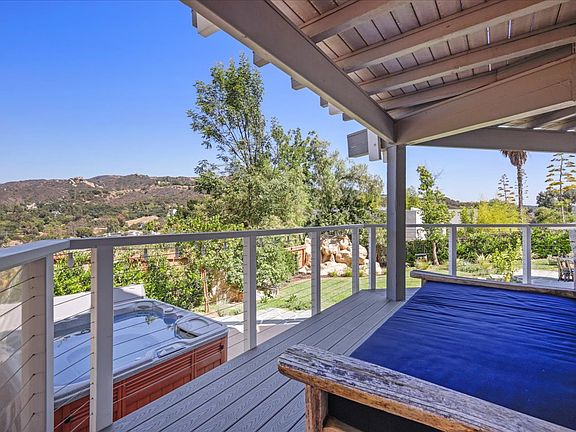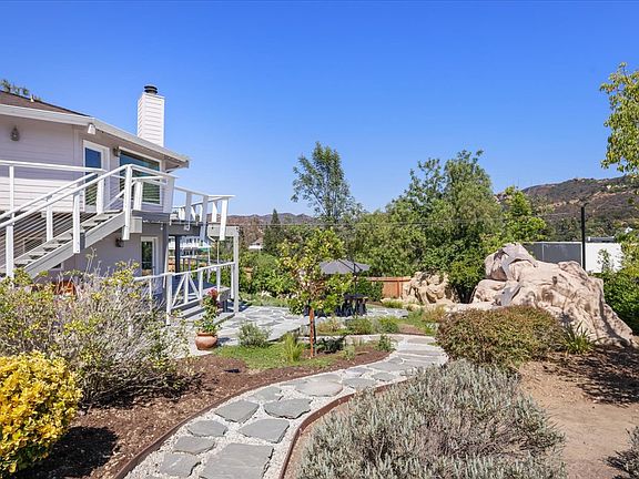 Available furnished or unfurnished. Welcome to this architecturally distinctive home, thoughtfully designed as a true retreat and quietly nestled in the heart of Topanga. Set on a spacious, newly landscaped lot, this 3 bedroom, 2 bathroom home blends architectural charm with seamless indoor-outdoor living. Inside this striking octagon-shaped home, vaulted cedar-beamed ceilings soar above expansive windows that capture mountain and canyon views, flooding the space with natural light. A cozy fireplace anchors the open living area, which flows onto a wraparound deck ideal for sunrise coffee or unwinding at sunset. The kitchen is outfitted with granite countertops and stainless steel appliances and opens directly to the main living areas, making it ideal for both entertaining & everyday living. The private backyard oasis has not only been newly landscaped but is also fully enclosed with rattlesnake fencing. A tranquil fountain and hot tub create a soothing atmosphere with the gentle sounds of flowing water. Whether you are soaking in the hot tub beneath the stars or strolling through the garden, every corner of this property invites a sense of calm. Located just a short walk tweo Topanga Living Cafe and nearby hiking trails, this home offers the perfect blend of nature and convenience. It feels worlds away while still being just minutes from both the coast and the valley. Additional features include a two-car garage, EV charger, and generous parking in the driveway. This inviting canyon sanctuary is ready for its next chapter!
