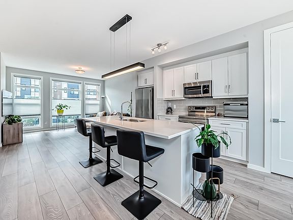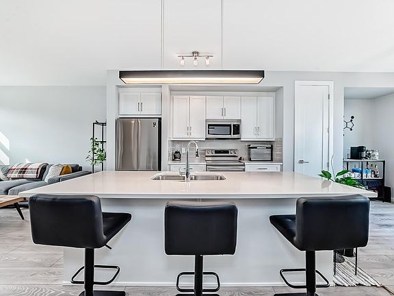 Beautiful 2 BEDS, 2.5 BATH(Bidets included), 2 CAR ATTACHED (TANDEM) Townhome Built by award winning AVERTON HOMES@ One at Keswick! This 1547 sqft unit w/NO CONDO FEES. The main floor is very modern & open floor plan. Oversized windows allows an amazing amount of light into the home! The kitchen has white cabinets, a beautiful back splash, quartz counters, stainless steel appliances & plenty of room to entertain in style. Just off the kitchen there is a large dining area that opens up to the spacious deck w/gas line for BBQ overlooking landscaped w/Built in SPRINKLER SYSTEM & fenced backyard. On the other side of the central kitchen you will find the perfect living room to unwind. Main features include a large living area, great dining space, stunning floor to ceiling windows & glass feature w/open raiser staircase. Upstairs is a primary suite w/3-pc ensuite, 2nd bedroom 4-pc bath & a laundry. Located close to shopping, schools, transportation, trails & MORE Great value in this home is hard to beat !
