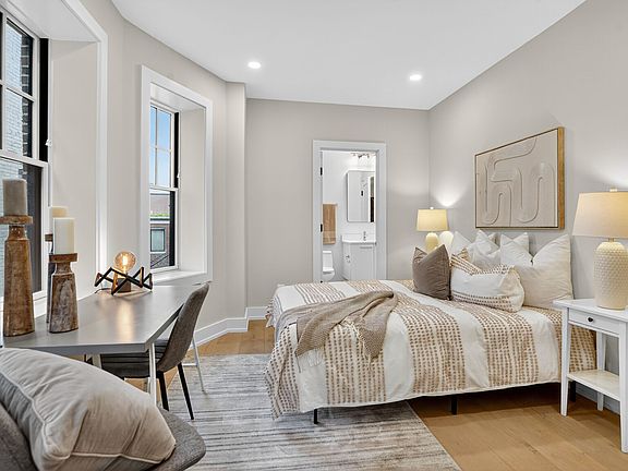 Relax in a serene retreat featuring a plush queen bed, modern decor, and ample closet space. The room includes direct access to a stylish en-suite bathroom with a walk-in shower and sleek finishes, making it both comfortable and convenient.