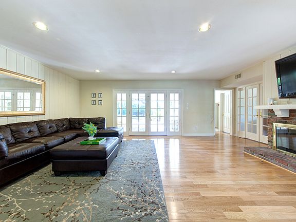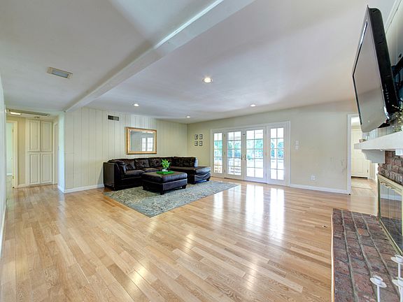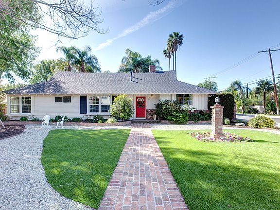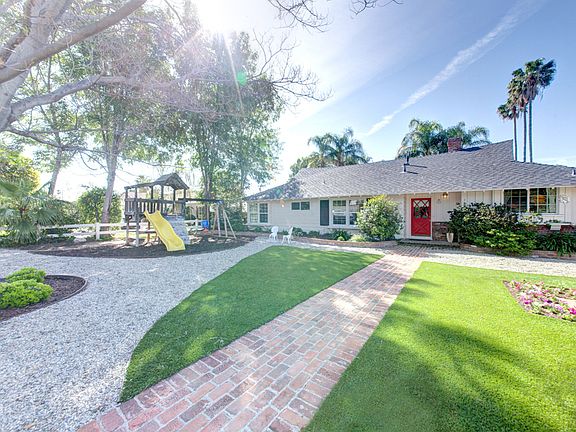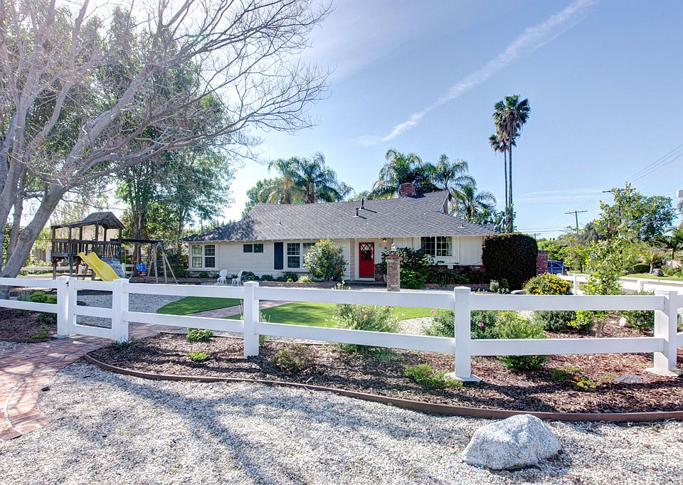 Wonderful Ranch Style home located on a corner lot with beautiful curb appeal, this home welcomes you to a white fence surrounding the front yard which has a park-like feel, with gorgeous drought resistant landscaping that includes over 700 SQFT of quality artificial grass for year round enjoyment, play area with rubber mulch, interior features large open living room with fireplace, formal dining room with fireplace that opens up into the living room and kitchen, light and bright kitchen with white cabinets with plenty of counter space, real hard wood throughout, remodeled guest bathroom, private master bedroom with French doors, two additional bedrooms, fourth bedroom/office with private bath, direct access to the garage, exit through French door into your own resort-like backyard, large brick laid covered patio with ceiling fans, palm trees, large pool with variable pool pump that saves on energy bill, in ground spa, gas fire pit, built-in BBQ Grill, outdoor shower for pool parties, sports court with basketball hoop, RV parking access and/or carport, highly sought after Granada Hills Charter High School.