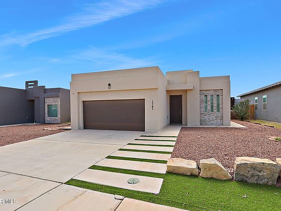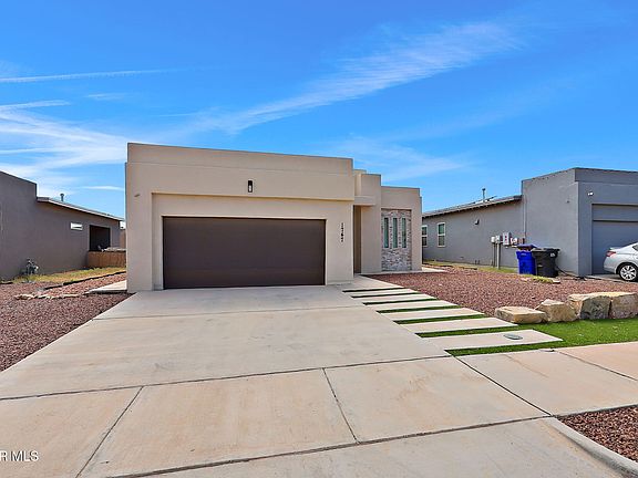 This contemporary space can be your next dream home! Featuring low-maintenance landscaping in the front yard, this home maintains a clean contemporary modern look throughout. Within the home are 4 spacious bedrooms with plush carpet and 2 full bathrooms. The home's living area features detailed ceiling designs with an open concept blending into the modern styled kitchen. This kitchen features a grand island conveniently close to the preparation area, making it perfect to make meals for your guests. All of this accompanied with large stone tile crafting a modern organic space. The home features a fully finished garage and a backyard featuring a patio, pergola, dog run, and privacy fencing. Located around the block from a nearby park with schools within the vicinity, and easy access to I-10. Don't hesitate on this El Paso hidden gem.