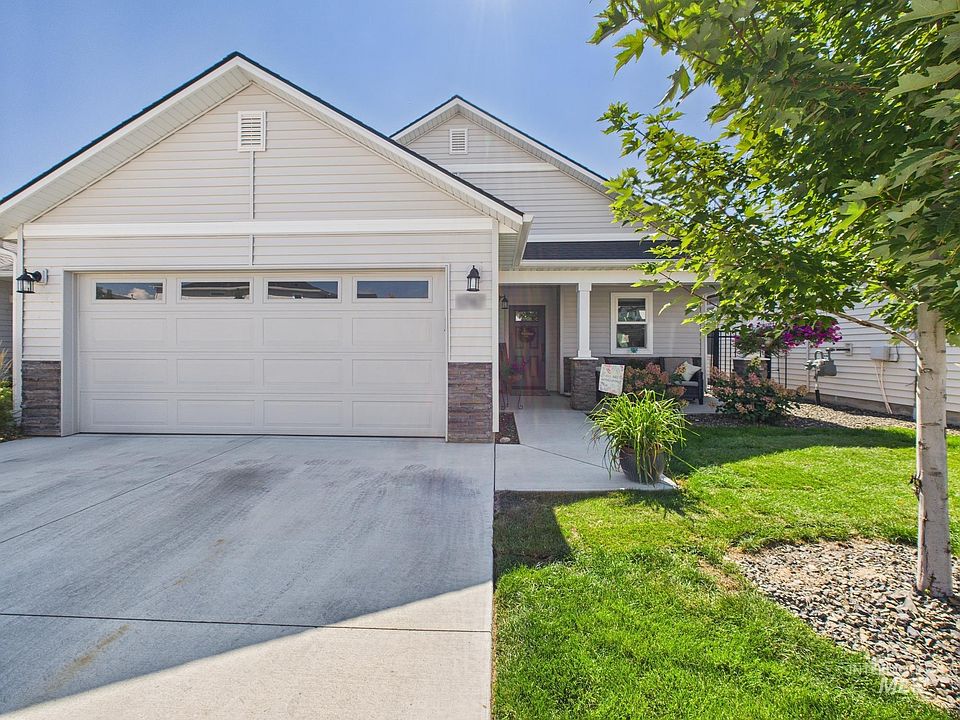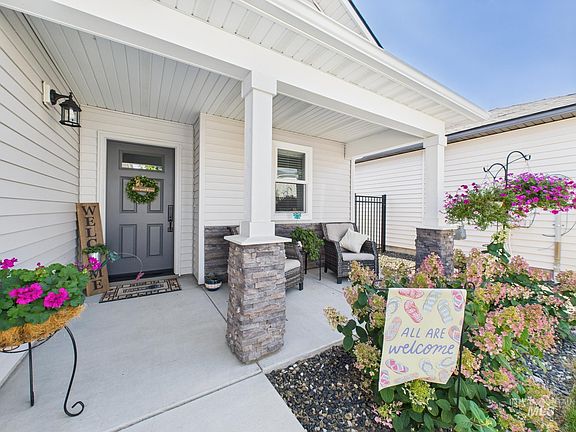 Welcome to this beautifully maintained single level, newer 2 bedroom with office/den, 2 bath townhome nestled in the highly sought-after Verado Subdivision in Meridian. Inviting front porch welcomes guest & provides spacious outdoor furniture arrangements. You'll love the seperate entry that opens to the living areas. Custom white kitchen cabinetry, SS appliances, Quartz countertops & gas range. The open-concept living area seamlessly connects the kitchen, dining, and living spaces—perfect for both relaxing and entertaining. Enjoy your quiet and private backyard retreat without the work—HOA covers front and backyard watering and landscaping maintenance, so you can spend more time relaxing. Outside your door, private pathways lead to a gated dog park and a neighborhood park complete with 1/2 size basketball courtsplayground/climbing equipment.-providing something for every household member. Ideally located with close proximity to The Village at Meridian, with shopping, dining & entertainment.