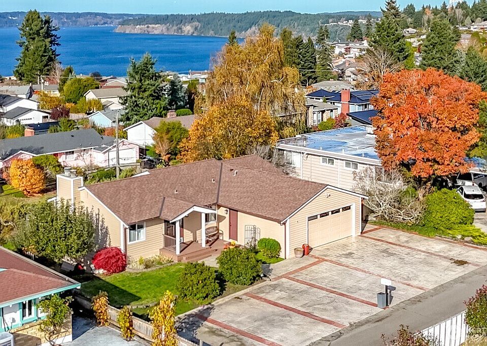 Immaculate 4 bed, 2.75 bath home in a highly desired neighborhood. Enjoy sweeping Puget Sound views from the main level (living, dining, kitchen, primary suite). Home is mechanically sound with a great roof and newer heat pump. The full daylight basement is designed for flexibility, offering a large family room, 3/4 bath, 1 bedroom, utility room, and an expansive bonus area—ideal for additional living area or multi-generational use. The oversized, well-manicured lot features designer slab with room for an RV. A true gardener's paradise: established fruit trees (apple, plum, fig), grape vines, and garden space. Includes an oversized 2-car garage and quiet alley access. Experience the perfect blend of views, flexibility, and prime location!