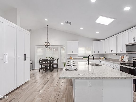 Stunning 6 Bed/3.5 Bath Remodeled home with TWO PRIMARY BEDROOM SUITES and NO HOA that shows like a magazine cover. Gorgeous kitchen has white cabinets, quartz counters, stainless steel appliances, and oversized pantry. Open floor plan with vaulted ceilings. Wood plank tile flooring throughout the main living areas. Large primary bedroom with walk-in closet and updated bathroom. Large 2nd primary bedroom with walk-in closet & bathroom suite. FOUR additional bedrooms AND sitting room off the living room. Relax in this great backyard with lush green grass. Need an RV gate to park your toys behind? We've got that as for you as well!