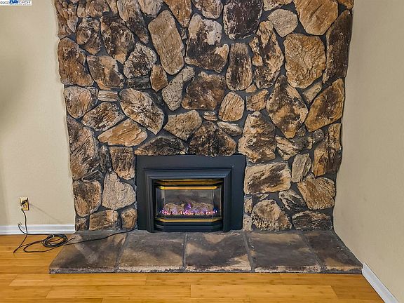 Ideal location for semi-urban living and access to the Bay Area. This 2 bedroom unit shares a 1.5 bath set up upstairs. The Main level features a large kitchen, dining area and living room with gas fireplace. Adjacent to the dining area is a patio slider opening to the balcony with views of the wooded area surrounding the complex. Central heating, bamboo flooring on the main living area and steps. Carpeting in both bedrooms and upstairs hallway. The unit also features 2 car attached garage w/opener, laundry with washer and dryer plus plenty of storage. There is a community pool, clubhouse and greenbelt area.