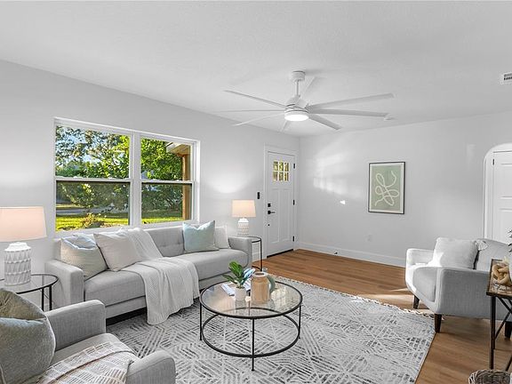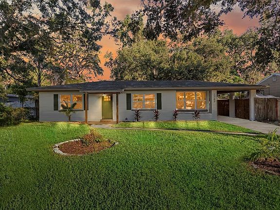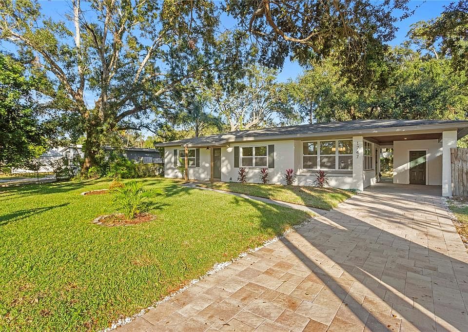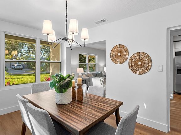 This fully remodeled 2 bedroom, 1.5 bathroom single story home is in a prime location just minutes from the many shops and restaurants of downtown Dunedin! Designer finishes and new luxury vinyl plank flooring are found throughout the home, which has a great floor plan perfect for living and entertaining. The spacious and bright living room is open to the kitchen which features new shaker cabinets, quartz counters, new stainless appliances and space for an eat-in area. Laundry and a chic powder bathroom are just off the kitchen, which also leads out to the covered car port with new tongue-and-groove ceiling. A separate dining room surrounded by windows streams in natural light. Two spacious bedrooms share the full bathroom which has a new tiled shower. The spacious fenced backyard has a seashell gravel patio and ample space for a pool. Other features include new impact-rated vinyl windows throughout, updated electrical and newer HVAC (2020) and water heater (2022), and a large storage room at the back of the car port. This home is nestled in a golf cart-friendly neighborhood of picturesque homes which the Pinellas Bike Trail runs right through. It is also a short stroll to Hammock Park, Dunedin Golf Club and Honeymoon Island. This home sat HIGH AND DRY with NO FLOODING OR STORM DAMAGE during Helene and Milton.