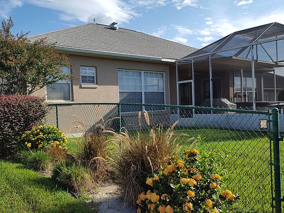 Don't miss this beautiful home in Stonecrest, on an oversized lot with a screened-in extended lanai and a huge hot tub. Featuring ten foot ceilings, an open kitchen with newer stainless appliances, formal dining area, and Cortec water-proof floors throughout. The large master suite has walk-in closets and double vanity sinks in the bathroom with a tiled shower. There's plenty of space with the triple slider opening to a large entertaining area by the hot tub. This energy efficient home has a 16 SEER HVAC in 2015 and solar powered attic fans, extra storage room in garage which includes shelving, and extra automatic screen door. Stonecrest is an established 55+ community that offers all the best amenities, next to The Villages.