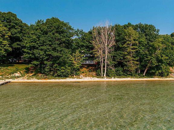 Nestled along one of the most tranquil stretches of waterfront on Old Mission Peninsula, this inviting home blends timeless charm with a setting that’s nothing short of spectacular. Inspired by traditional Swedish cottages, the residence offers warmth and character throughout its 1,550 square feet, featuring rich redwood walls and ceilings, maple hardwood floors, and clear cedar trim. Immediately upon entering the home, you'll be wowed by the design and custom touches, like the open stair case at the heart of the home, which allows for unobstructed water views from the moment you step inside. The main living space is anchored by a cozy fireplace with custom built-ins and a wall of glass doors that frame breathtaking views of East Bay. Upstairs are two bedrooms - each with stunning water views - plus a non-conforming third bedroom. Set on a beautiful 1.2-acre lot with towering mature trees, the property boasts 150 feet of private, direct waterfront—a perfect vantage point to enjoy stunning sunrises over the glistening waters of East Bay. Outdoor living is just as inviting, with a brand-new back deck added in 2024. Boaters will appreciate the notoriously calm waters of East Bay, with easy access via boat to some favorite local spots such as Old Mission Harbor (Haserot Beach), the village of Elk Rapids or Petobego sandbar. Life on this part of Old Mission is idyllic and feels like a world of its own… bike to Old Mission General Store for a sandwich or snack, go hike the trails surrounding Old Mission Lighthouse, stop by one of the many roadside fruit stands or wineries, or stop by Seven Hills/Mission Proper for morning brunch (or drinks/music in the evening). Additional features include an oversized one-car garage, forced air heating and A/C (natural gas), and updated windows and doors on the lake-facing side of the home (within the last 15 years). This is a rare opportunity to own a piece of peninsula paradise—peaceful, picturesque, and ready to enjoy.
