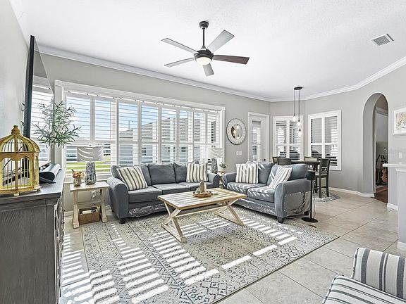 Stonecrest is a private, gated community w/ controlled access. Avondale Model located in the Hills neighborhood. This is a must see home with a golf cart garge and 10' ceilings throughout.The square footgage of the home indicated by public record reflects 1768 sf, but the open integrated space is 2020 sf. inside the home. Please be aware of the entry/exit gate as you stop at the guard station and enter and exit the community. Third bedroom does not have a closet, but it does have French doors with privacy glass inserts and is a flex room. Welcome to your next chapter in this vibrant Adult, private gated, golf cart-friendly community just outside The Villages in North Central Florida! With an incredibly low HOA fee of just $148/month, you'll enjoy resort-style living with access to a welcoming clubhouse, casual dining, 18-hole golf course, four community pools—including a luxurious indoor saltwater pool—plus a well-equipped fitness center and much more. This beautifully updated home is move-in ready and offers exceptional value. Major upgrades include: New Roof (2020), HVAC (2018), Water Heater(2012), All Newer Exterior Windows (2019), Upgraded Flooring, Appliances, and Plantation Shutters, Fresh interior paint, Step outside to enjoy thoughtfully landscaped grounds with stone accents, shrubs and Palm trees. The two-car garage also features a dedicated golf cart garage, utility sink, attic storage with shuttle access, and an electric retractable screen door for added ventilation. An exciting bonus: the former screened lanai has been permitted and professionally enclosed (2014), creating an additional 252 sq. ft. of heated and cooled living space—not included in the listed square footage, a great feature. Conveniently located near the community center, this home offers both comfort and connection. 3rd. bedroom/ den no closet, but with privacy glass inserts in the french doors. Also note that there is a Ring camera which is active. Schedule your showing today—this one won't last long!