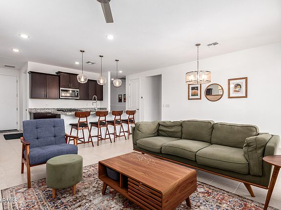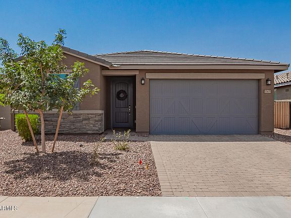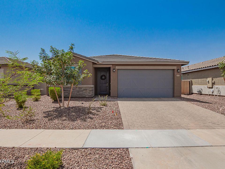 Welcome to this beautifully maintained gem in the desirable Desert Oasis community! Boasting a spacious 1,568 sq.ft. layout, this 3-bedroom, 2-bath home offers a bright and open floor plan with soaring ceilings that create an airy, inviting atmosphere. The stylish kitchen is a chef's delight, featuring granite countertops, stainless steel appliances, and a generous island with breakfast bar seating. The primary bedroom boasts of an en suite bathroom and large walk-in closet. This home is equipped with Smart Home technology by Safe Streets, including front door lock, video doorbell, thermostat, garage door, motion detector, door sensors and Smart Home Hub & App. The refrigerator, washer & dryer are included as well! Step outside to an expansive backyard, with $10K in landscaping upgrades, including custom-paver covered patio, walkway and decorative gravel--perfect for relaxing or entertaining. This home delivers all the perks of new construction--without the wait. Enjoy community perks like a beautiful park and sparkling pool, and just minutes from shopping, dining, schools & freeway access.