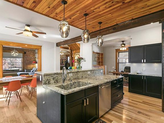 Beautifully remodeled main floor unit in historic Denver Square. Wood flooring throughout and high ceilings, expansive gourmet kitchen with Garland 8 burner gas stove, full length granite island, bay window, 2 ceiling fans, A/C, original built-ins with grand entry shared by only 2 units. Live-Work space so you could office out of the space and meet clients. Signage in front is allowed and can be installed. Owner approved businesses only based on Denver requirements. Garage parking =$100/month - lots of attic storage in garage and oversized spaces- room for a shelving/cabinets/bikes/skis/etc. laundry in mud room off the back entry with utility sink shared by 3 units. private patio space as well as a shared patio space with gas grill. Move In Date is flexible. Building has 4 units, one on each level. All new 1 inch wood flooring throughout main unit and second floor unit for sound barrier. Owner managed, landscaping included, snow removal not included. Shared fenced grass yard and shared large front porch with only one other unit as well with ceiling fan. Great space!! Clean and well maintained home. You will love living here!! One year lease, $100/month utility fee includes all utilities except wifi, cable, phone - all wired for cable and internet.