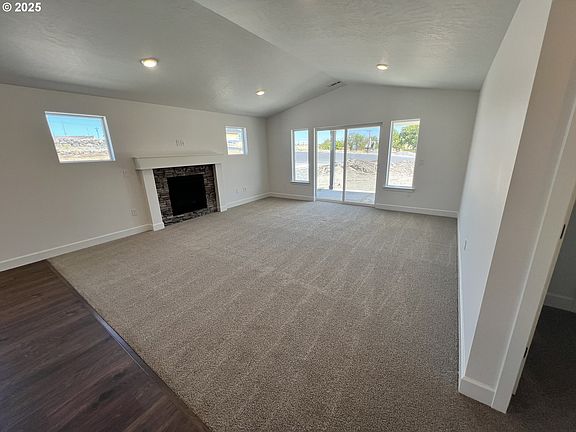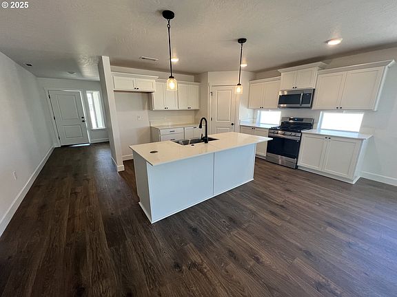LOT:TE136 - Under construction - Estimated completion date June 2025 - This exquisite brand new 1892 SQFT one level modern farmhouse offers the perfect blend of contemporary design and comfortable living situated on a spacious corner lot. 3 bedroom 2 baths with luxurious primary suite with double sinks, shower, freestanding soaking tub, and large walk-in closet. Deluxe chef's kitchen with quartz counters, walk-in corner pantry, island, farm sink, and stainless steel appliances including gas range and dishwasher. The Charity plan in the desirable Cimmaron Terrace neighborhood in Hermiston OR. Built by award winning builder MonteVista Homes. Open concept living, vaulted ceilings, great room, 95% high efficiency gas forced air heating, air conditioning, laundry/mud room, gas fireplace, and covered patio.