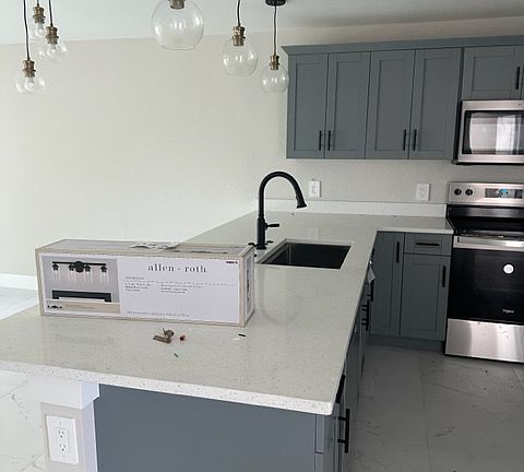 White quartz countersLarge open quartz kitchenStainless steel appliances