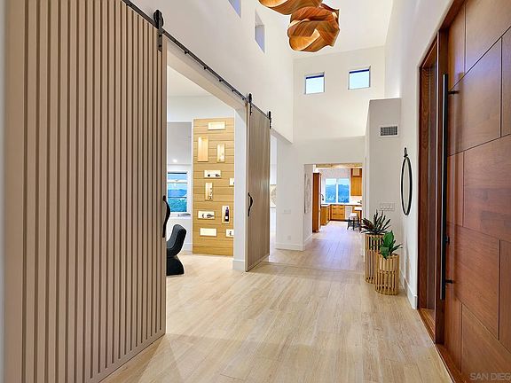 A Tulum-inspired, top-to-bottom remodel w/soaring ocean & Batiquitos Lagoon views. On a leafy one acre lot, Andrade Architects nurtured an earthy-luxe vibe for this 5BR, 5.5 BA renovation combining organic materials w clean lines. Everything is custom: The primary spa experience w/heated floors, walnut cabinetry & the mood-lit foyer for sunset happy hour. Downstairs: Enjoy a media room, guest quarters & a speakeasy. Plus: A newly retiled pool & spa. Private location & close to beaches, dwntwn Leucadia. Architectural Cred: The OC-based Andrade Architects is known for the finest craftsmanship. Here, they enlisted new floors, lighting and new bathrooms for this luxurious renovation. The arrival reflects the level of craft with a custom 10-foot walnut pivot door, opening onto a seaview foyer illuminated with custom wine storage. There’s new custom cabinetry, new fireplace facades and all new tiles and fixtures in the 5.5 bathrooms. The pool and spa sparkle with new tile. The floor plan is designed to connect and disconnect in equal measure. The primary retreat boasts a resort spa experience with heated floors, steam shower & deep soak tub. Outside, there’s a retiled pool and spa with new slipproof decking. Plus: An outdoor area to chill, grill & entertain. Prime Location: Close to the beach, just East of I-5, and near Batiquitos Lagoon, Fox Point Farms, Encinitas Ranch Golf Course, La Costa and Aviara. Private & Secure: Located on a gated property on a cul-de-sac dotted with mature Torrey Pines, this area offers both privacy and access to the North County lifestyle.