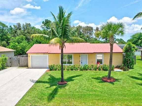 Introducing 1749 SW Gemini Lane, Port Saint Lucie... An impressive 2/2 ranch home with a pool, metal roof, newer air conditioning, new floors and more! The backyard is ideal for your family to spend time around the pool. It's complimented with a completely screened in and covered lanai that sits next to the pool. Pool deck equipped and ready for child safety fence for the little ones!Updated landscaping around the house, flat roof replaced 2021, New floors and baseboards throughout, new fans in patio and keyless entry!There is a covered patio that leads to the detached utility/ laundry room, it is not under air.