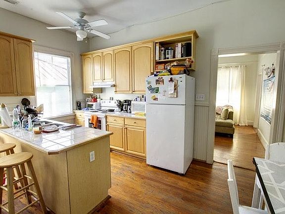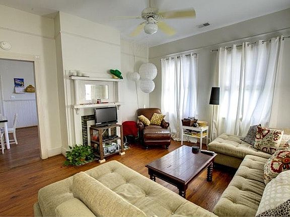 This is one of the largest apartments that we have in our inventory. The unit occupies the entire second floor and most of the third floor of this large house. It has four bedrooms, and all but one are more than spacious. Three of the bedrooms are on the second floor, and share two full baths. The fourth bedroom is enormous and occupies the third floor along with a third bath. All of the bedrooms have fabulous closets, and the attic is also available for overflow storage. A large front porch spans the front of the building overlooking an attractive courtyard, and second large porch provides additional space for entertaining and enjoying our nice climate. The building has nice architectural features such as hardwood floors, good closets, fireplaces, circular stairway, good natural lighting, wainscoting, plaster walls and nice trim. A large modern kitchen and a spacious living room with fireplace round out this highly sought after apartment. Features: Off street parking available, central heat and air, appliances including dishwasher, washer/dryer, TV/Tel/Internet connections in each room, security system, ceiling fans, pest control service, lighted parking lot and common areas, subletting permitted, pets permitted, roommate matching, and a fabulous location with on site management. 1 year August - July
