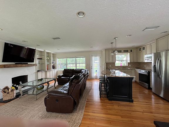 Direct pond viewOpen concept family roomWood burning fireplaceBeautiful hardwood floors
