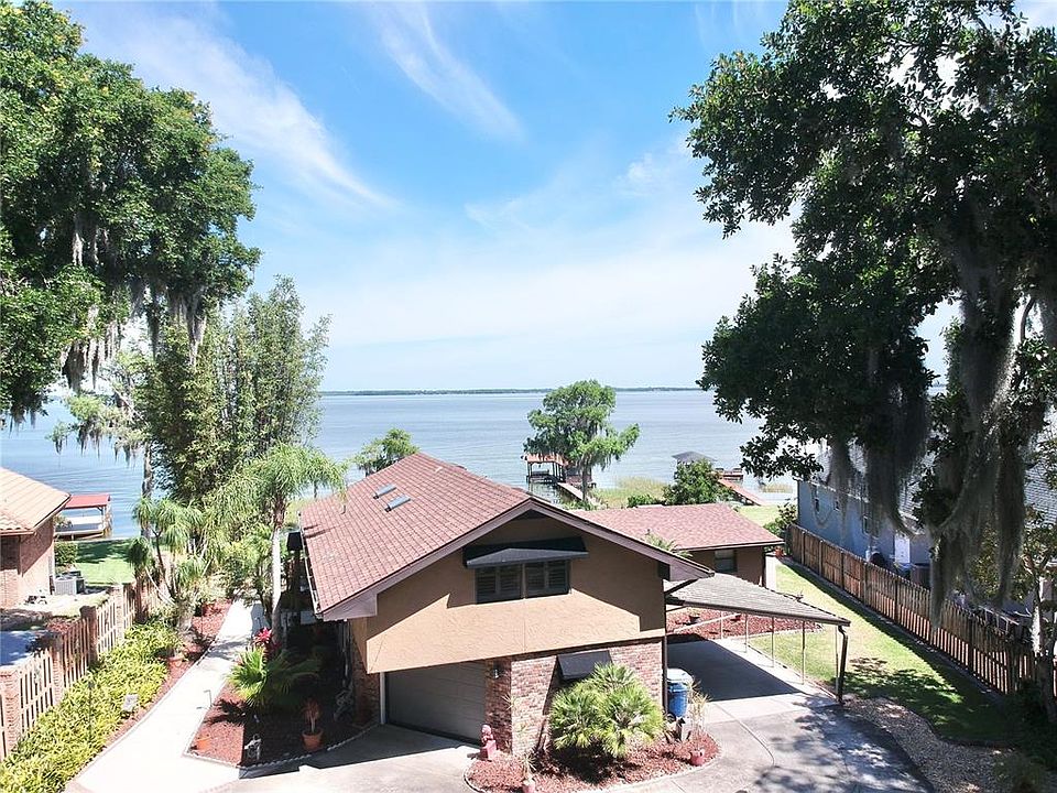 Step into your dream oasis on the shores of Lake Eustis, on the chain of the lakes. Where stunning views meet endless adventures. This two-story home boasts unrivaled vistas and is perfect for outdoor enthusiasts, boaters, and fishermen. With no homeowners association to limit your freedom, you can enjoy the meticulously maintained beauty of this property. Imagine hosting unforgettable gatherings by the pool surrounded by custom landscaping or setting off on boating excursions from your own dock equipped with a hoist. With four bedrooms and three bathrooms, including a master suite with panoramic lake views, luxury abounds in every corner. But the perks don't end there. Picture yourself enjoying meals in a formal dining area overlooking the tranquil waters or relaxing in the open kitchen that seamlessly flows into the living room and screened lanai. Plus, with a roll-up screen in the garage and an AC unit under service contract through April 2025, comfort and convenience are guaranteed. Outside, a spacious circular driveway with a carport ensures ample parking for guests, while a covered sitting area provides the perfect spot to savor breathtaking sunsets. And when you're ready for more adventure, downtown Tavares is just a short golf cart drive away, offering festivals and a vibrant dining scene. Live the ultimate waterfront lifestyle in one of Tavares' most sought-after locations, where every day feels like a vacation.