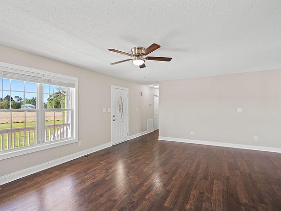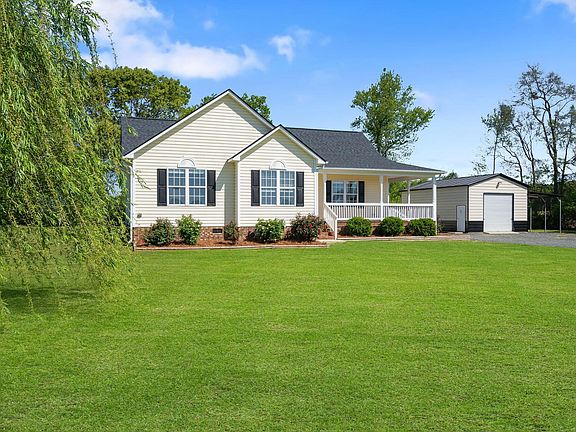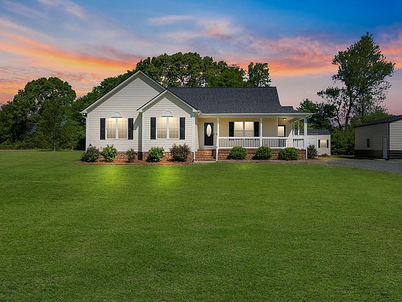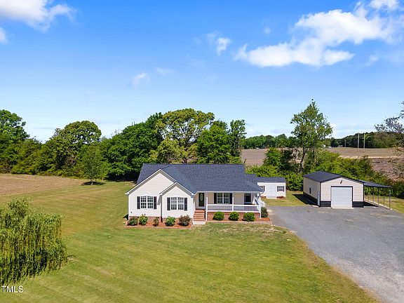 Experience true country living on this beautiful 2.19+/-acre open lot, overlooking picturesque fields! This charming ranch home features a welcoming corner wrap-around front porch and a spacious back deck—perfect for relaxing or entertaining. Step inside to find fresh paint throughout, an open floor plan with a cozy living room fireplace, and a stylish kitchen complete with custom cabinetry and stainless steel appliances. The oversized primary suite offers a nice retreat with a large stand-up shower and an indulgent soaking tub. Outside, enjoy a massive detached garage with a carport, plus an additional storage building—both equipped with electricity. This one checks all the boxes for peaceful country charm with all the modern conveniences!