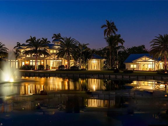 An MHK-designed masterpiece on one of Pine Ridge’s desired streets. Set on 1.66 acres with a serene lake and dramatic fountain, this private estate features four structures: a main residence, a club room, flex space and guest house. Designed for seamless indoor-outdoor living, the open plan flows to a resort-style pool and spa, outdoor kitchen with gas grill, pizza oven, evo grill, dining and lounge areas, and a cozy fire pit. The gourmet kitchen boasts Wolf and Sub-Zero appliances plus a butler’s pantry with wine storage. The main home offers four bedrooms with en suites, an office/fifth bedroom, and an upstairs bonus room. The primary suite is a private sanctuary with a spa-like marble bath, soaking tub, dual showers, steam and outdoor shower. The versatile club room can serve as a game room, studio, office or extra suite, while the flex space is ideal for a gym, art studio or garage. A two-bedroom, two-bath guest house with full kitchen completes this remarkable property. Near beaches, Mercato and Waterside Shops, it’s a rare must-see.