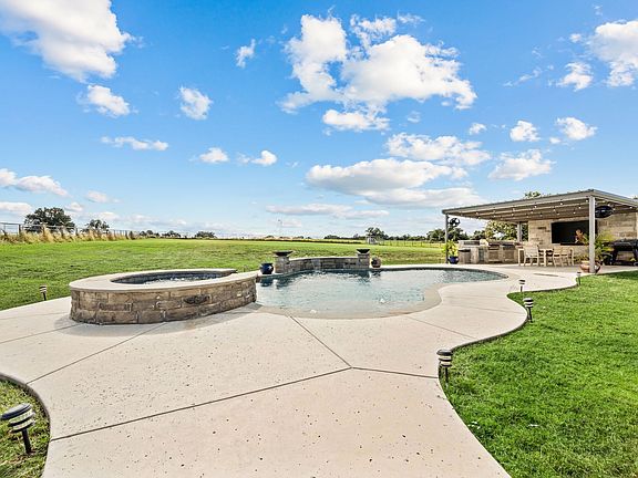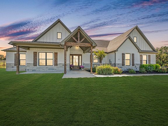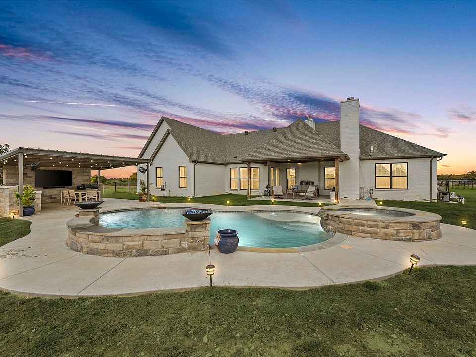 Welcome to 175 County Road 1109 in Decatur, Texas — a beautifully designed modern farmhouse on 2 acres that delivers the peace of country living with an easy commute into the DFW metroplex. Built in 2022 and meticulously maintained, this home blends timeless craftsmanship with today’s most desirable finishes. The open-concept layout features vaulted ceilings, warm natural light, and a cozy brick fireplace that anchors the main living area. The kitchen is straight out of a magazine — granite countertops, custom cabinetry, double ovens, and a hidden back-kitchen pantry that’s as functional as it is impressive. With 4 bedrooms, 3 baths, and over 2,700 square feet, every detail has been thoughtfully planned for comfort, flow, and modern living. The primary suite is a true retreat, complete with a spa-worthy bath and a huge walk-in closet that conveniently connects to the spacious laundry room for everyday ease. Step outside and you’ll instantly feel like you’re on vacation — a pool with spa, outdoor kitchen, and covered patio with fireplace create your private backyard oasis. The buried propane tank efficiently powers the spa, pool, and outdoor living area, making entertaining effortless year-round. The 2-acre lot is fully fenced, so your four-legged friends will love you forever — and if you’ve ever dreamed of adding a few chickens to the mix, they’ll fit right in, too. This home offers the perfect balance of style, space, and serenity — all just a short drive from shopping, schools, and major highways.