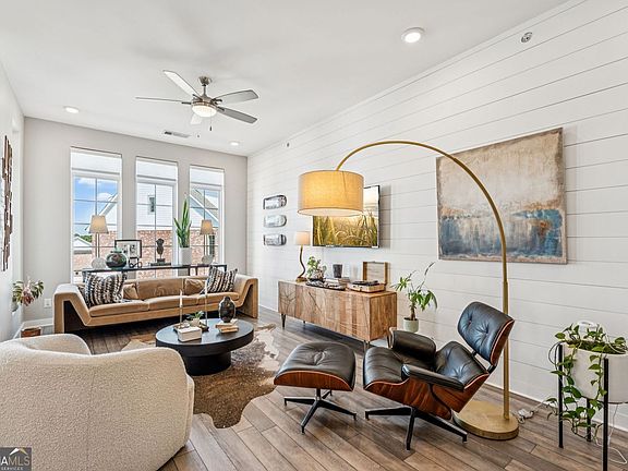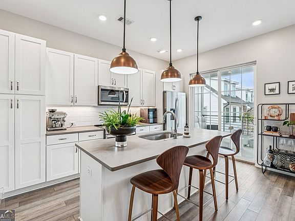 Stunning Top-Floor Condo at The Maxwell! - Walk to Everything! Live within walking distance of everything Alpharetta has to offer in this beautifully upgraded home. Step inside and you'll notice designer touches throughout-from shiplap accents and a custom entertainment setup in the Family Room to remote-controlled Hunter Douglas shades, pendant lighting, and plantation shutters in the owner's suite. The open floor plan is perfect for entertaining. The modern Kitchen shines with concrete-finish quartz countertops, subway tile backsplash, spacious island, stainless steel appliances, and crisp white cabinetry. The owner's suite boasts tall ceilings, a ceiling fan, walk-in closet, and a luxurious bath with a double shower (featuring two shower heads and room for a bench) plus an expansive vanity with ample storage. A convenient half bath is also attached to the owner's suite. This modern layout also includes a flex space with windows and an oversized closet, ideal as a home office, nursery, or guest suite. Extra perks include multiple storage closets, a 1-car garage with a driveway long enough for a second vehicle, and additional guest parking nearby. All this just steps away from The Maxwell Retail, the Alpha Loop, and downtown Alpharetta, where you'll love weekly food trucks, farmers markets, festivals, dining, shopping, and entertainment. With quick access to GA-400, Milton, and Roswell, the location couldn't be better.