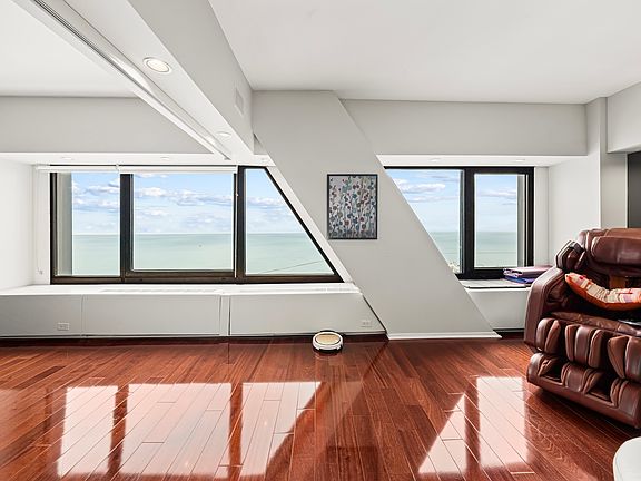 Beautifully designed east-facing residence with breathtaking views of Lake Michigan, Navy Pier, the city skyline, and boats along the waterfront. This spacious one-bedroom plus den (originally a two-bedroom) features a versatile floor plan with an accordion door spanning the length of the den wall, easily converting the space back into a true second bedroom for privacy and flexibility. The modern white kitchen is equipped with a breakfast bar, mirrored backsplash, Gaggenau appliances, a Sub-Zero refrigerator, under-cabinet lighting, and elegant built-in glass shelving. Marble bathrooms offer a timeless look, with the primary bath featuring a large walk-in shower. The entry foyer and living area are accented with sophisticated mirrored walls, recessed lighting, and neutral carpeting throughout, creating a bright and inviting atmosphere. Enjoy stunning lake views from every window in this exceptional home perfectly positioned to capture some of Chicago's most iconic scenery.