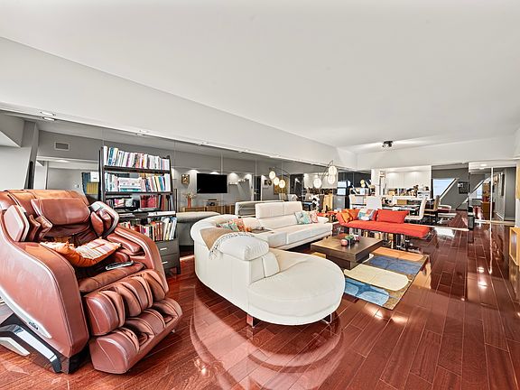 Modern white kitchenSophisticated mirrored wallsRecessed lightingMarble bathroomsVersatile floor planGaggenau appliancesBreakfast bar