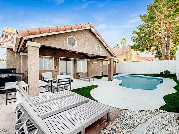 This beautiful single-story home in Henderson offers bright, spacious living areas with high ceilings and tile-finished bathrooms. The open-concept primary suite features a generous bedroom, large bathroom, and walk-in closet. Enjoy low-maintenance desert landscaping in both the front and backyard, plus a pool and patio area perfect for outdoor living.