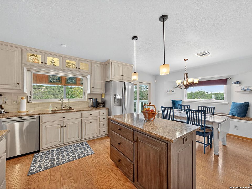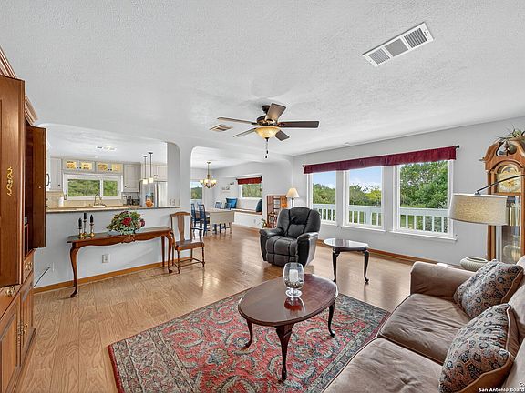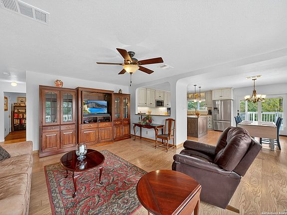 Nestled at the end of a cul-de-sac in Lakehills, this beautifully updated home offers the perfect blend of privacy, functionality, and Hill Country scenery. Sitting on two acres, this property is designed for both relaxation and productivity, featuring a unique floor plan with two primary bedroom suites and two additional spaces ideal for offices or flex rooms.  Enjoy stunning views from the expansive deck off the kitchen, or unwind in the hot tub while taking in the serene surroundings all only a 5 minute drive to the elementary school. The property is rich with features, including a koi pond, a deer tight fence and a walk out "basement" for extra storage. The metal roof with solar panels, along with new windows and French doors, enhances energy efficiency and modern comfort. Car enthusiasts or hobbyists will love the attached two-car garage plus a detached two-car garage, which includes a heated and cooled bonus room above-perfect for a crafting studio, or game room. Inside, you'll find updated flooring, an updated kitchen, and a beautifully upgraded primary bathroom. Whether you're looking for a peaceful retreat or a functional home with versatile spaces, this Lakehills gem has it all! Don't miss this opportunity to own a slice of Hill Country paradise just minutes from Medina Lake. The neighborhood also features a neighborhood pool, playground and boat launch.