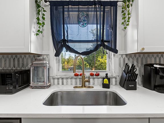 Brick homeBeautifully updated homeRanch styleGleaming kitchenStainless steel appliancesWhite cabinetryGorgeous tile backsplash