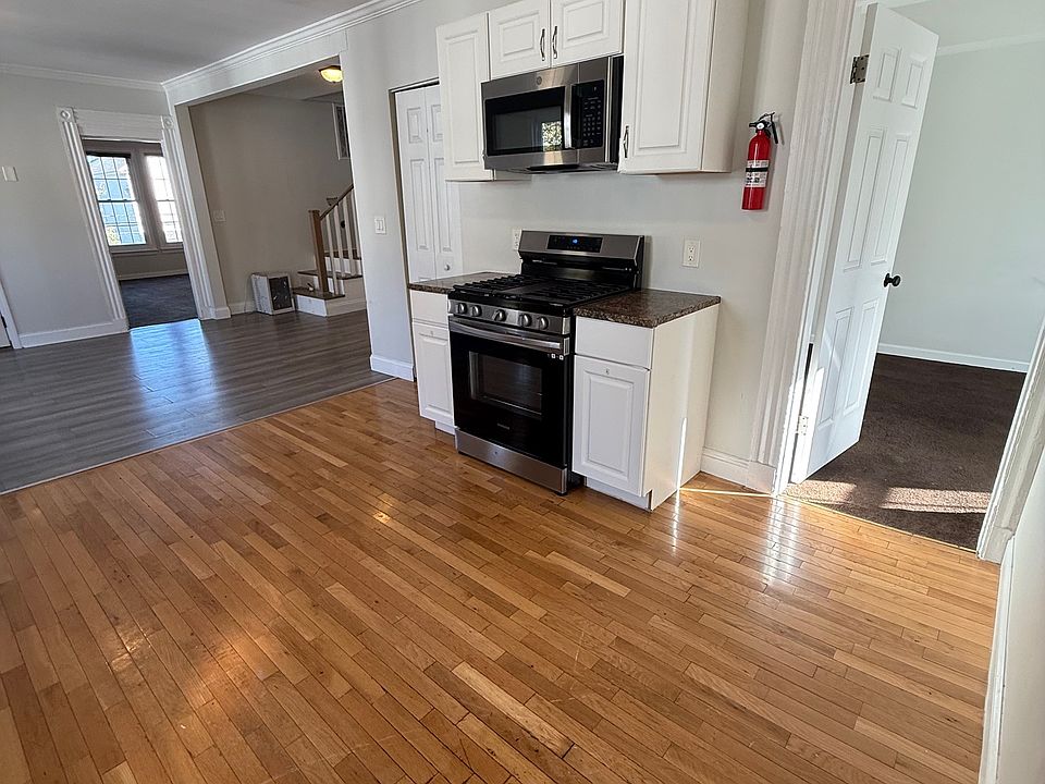 This spacious and modern second-floor unit has been recently renovated, featuring new flooring, a stylish kitchen, and fresh paint throughout.