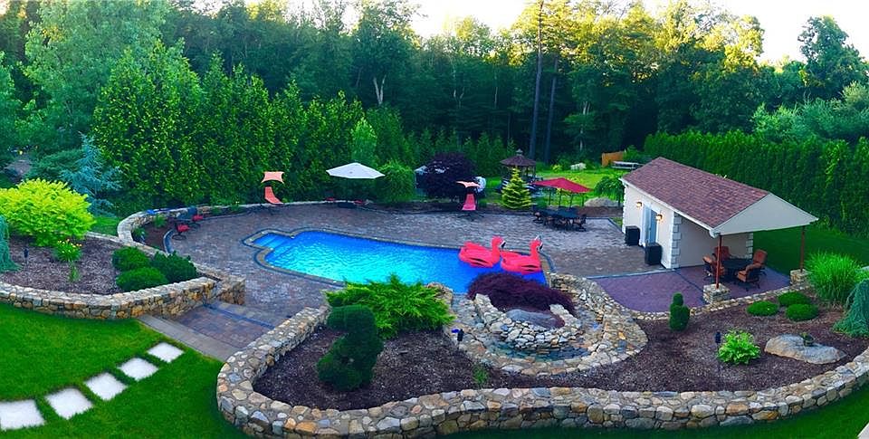 Cozy fireplaceSaltwater inground poolUtility roomLaundry areaStone wallsDouble waterfallsHuge perennial garden
