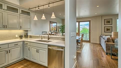 Sleek and sophisticated is the theme of this downtown, luxury condominium. Beautifully Maple Floors throughout, clean and modern painted cabinetry with unique, quartz countertops. Custom light fixtures throughout bring a big city vibe to this high quality home that's just a stone's throw from the Plaza. Impressive kitchen has stainless appliances and an enormous, walk-in pantry with built-ins. In addition to the Master Suite, there is a roomy den with double doors and built-in desk. Knotty Alder windows and French Doors, Lennox gas fireplace and add to the top quality feel of this home. Large walk-in closet, spacious bathroom with quartz countertops and glass tile backsplash + a well positioned light well to bring some additional natural light. Deeded underground parking & temp controlled storage. State of the art light, security monitors at the residence entry & inside the home + security cameras throughout the building. LEED platinum Certified and top of the line throughout.