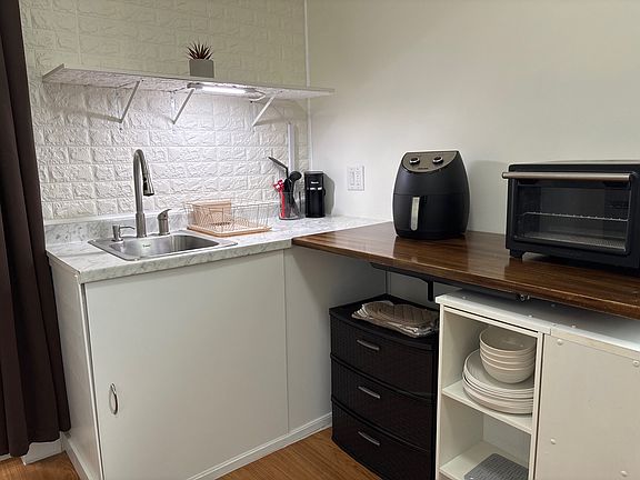 Kitchenette with sink, refrigerator, microwave, toaster oven & air fryer.