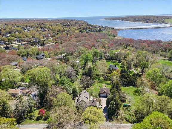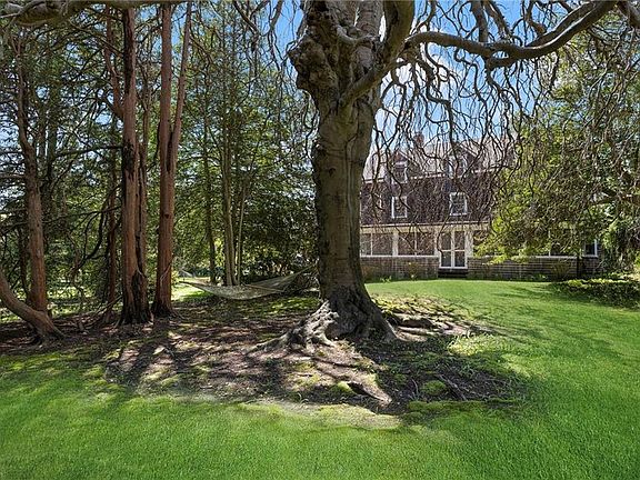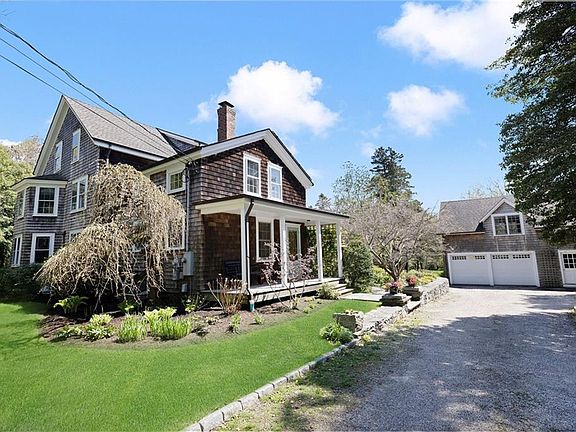 "Thorncroft", circa 1860, a Shingled Cottage with architectural details throughout as well as modern amenities, located in the heart of the village. Sited on 1.39 acres of an 'arboretum-like' property with extraordinary specimen trees and beautiful grounds with wide open green spaces. This West Ferry residence is a short stroll to Dutch Harbor marina and the village, and has 6 BR, 3.1 BA, a large screened in porch, and a carriage house with storage space on first level and a lovely 27'3" x 22'5" studio space above with heat and a full bath. This home has been meticulously updated with a historically respectful renovation. Welcoming Ipe front porch leads to a drop zone with lavette. Enter the family room with fireplace and vaulted ceilings that is open to the chef's kitchen with high end appliances. A loft area could be used for additional office or rec space, your choice. Access to an Ipe deck and slate patio are here also. Dining room w/ stained glass, living room with built ins and a 2nd fireplace. A home office/den completes this level. Additionally, there is access to the rear screened in porch, and another deck off the living room make for great entertaining.2nd floor has primary bedroom w/bath, 2 more BR, full BA, and laundry. Third level has rec room, 3 BR and full bath. Raised garden beds, rare trees, lush plantings, slate patios, solar panels, and even a tree house! A very rare offering!