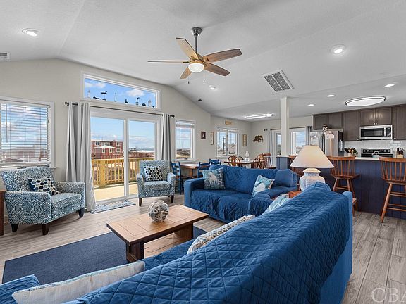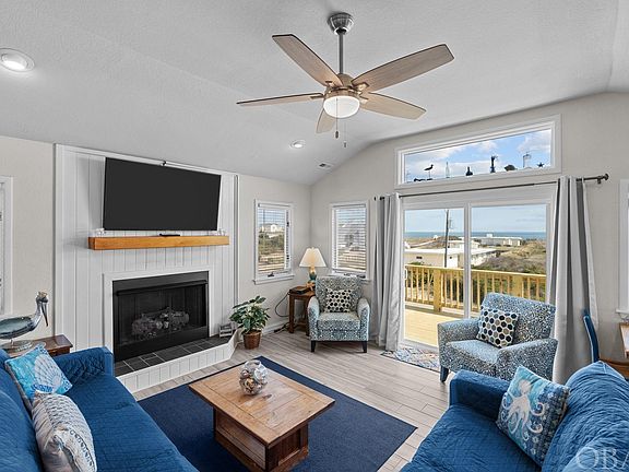 This beautiful well maintained semi-oceanfront home is tucked away on a quiet street, just a few steps away from two separate beach accesses. This sought after Southern Shores location is away from the hustle and bustle, yet only minutes from restaurants, shops, movies, golf and so much more. The upper level of this home features an open concept design with a fully updated kitchen with plenty of bar seating, two dining areas, great room with gas fireplace, vaulted ceilings and direct access to an east facing sun deck and screened-in porch - the perfect place to take in the stunning ocean views. The covered deck below is yet another great spot to enjoy the outdoors and ocean breeze. On this mid-level you will also find a laundry closet, four spacious bedrooms (one en-suite) and an additional full bath. All new LVP flooring and new paint throughout. Dry entry and enclosed storage on ground floor. Outdoor shower, fish cleaning station, outdoor pool with large sundeck for relaxing. Lots of parking! House is being sold fully furnished.